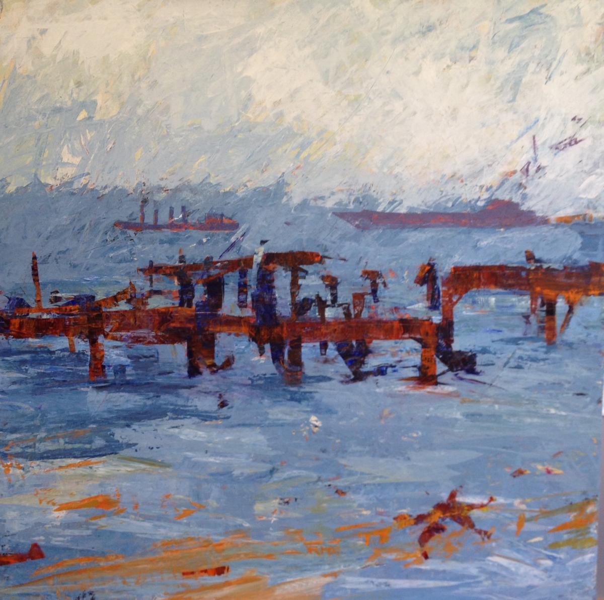 Sold. Painted on canvas showing abandoned dock in San Francisco Bay.